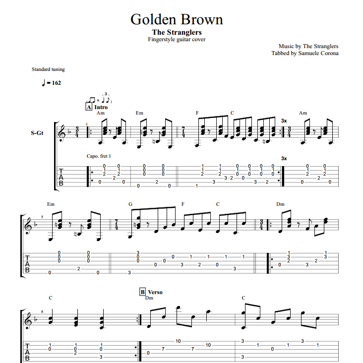 Golden Brown - The Stranglers - Fingerstyle guitar TAB